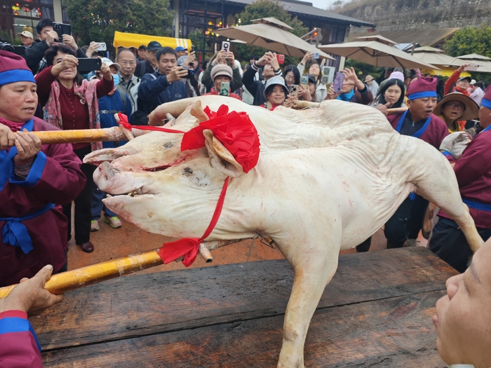 ③最后燃鞭炮,现场浅尝新鲜猪杂粥、吕田大肉。