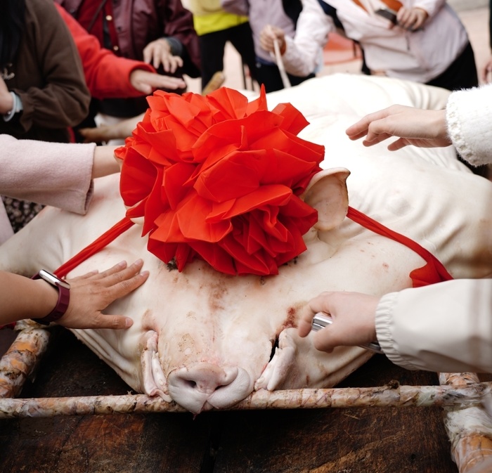 祈福完后进入到切福猪环节,祈福开运、代表福运富足。