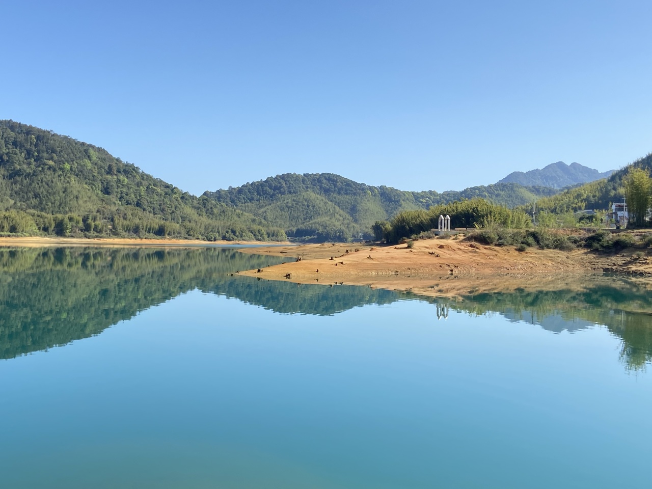 这里的湖水清澈见底,远远望去,宛如一块碧玉,配上几分宁静小杉村,宛如一幅画卷。