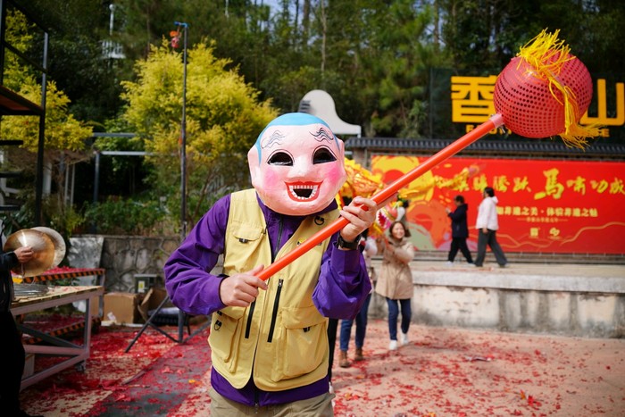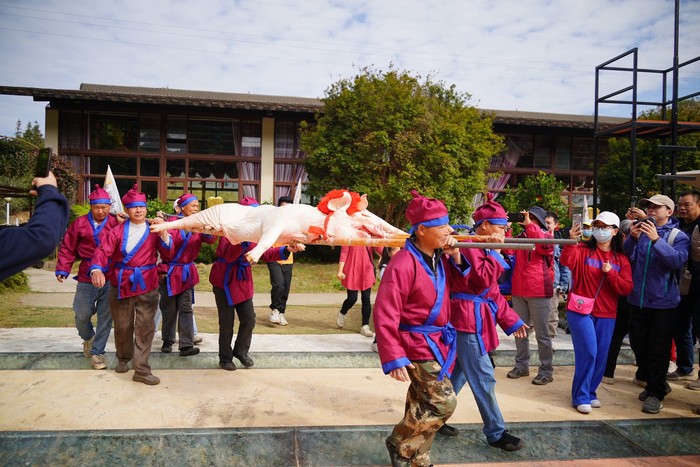 ①基地会把一头剃完毛的大福猪绑在架子与戴好大红花,游客们可参与抬福猪绕广场走动的环节,寓意着团圆、幸福与美满;摸摸猪头,事业学业更上一层楼,摸摸猪身,事业财运都就手。