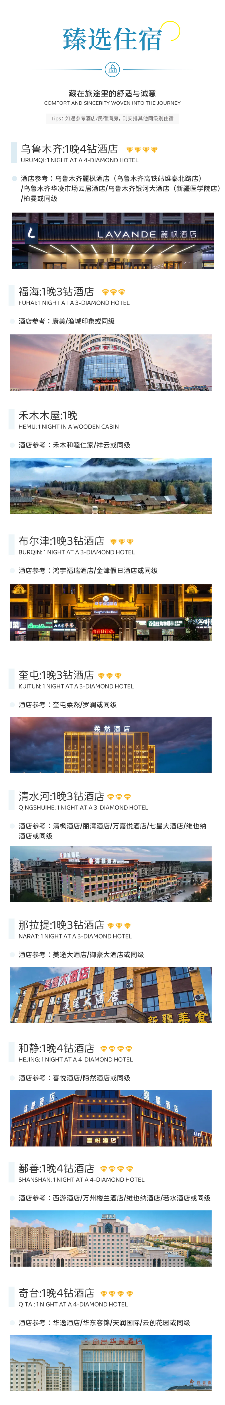 备注:钻级标准参考携程钻级标准,未挂星。新疆经济较为落后,酒店较南方酒店略差,敬请谅解;