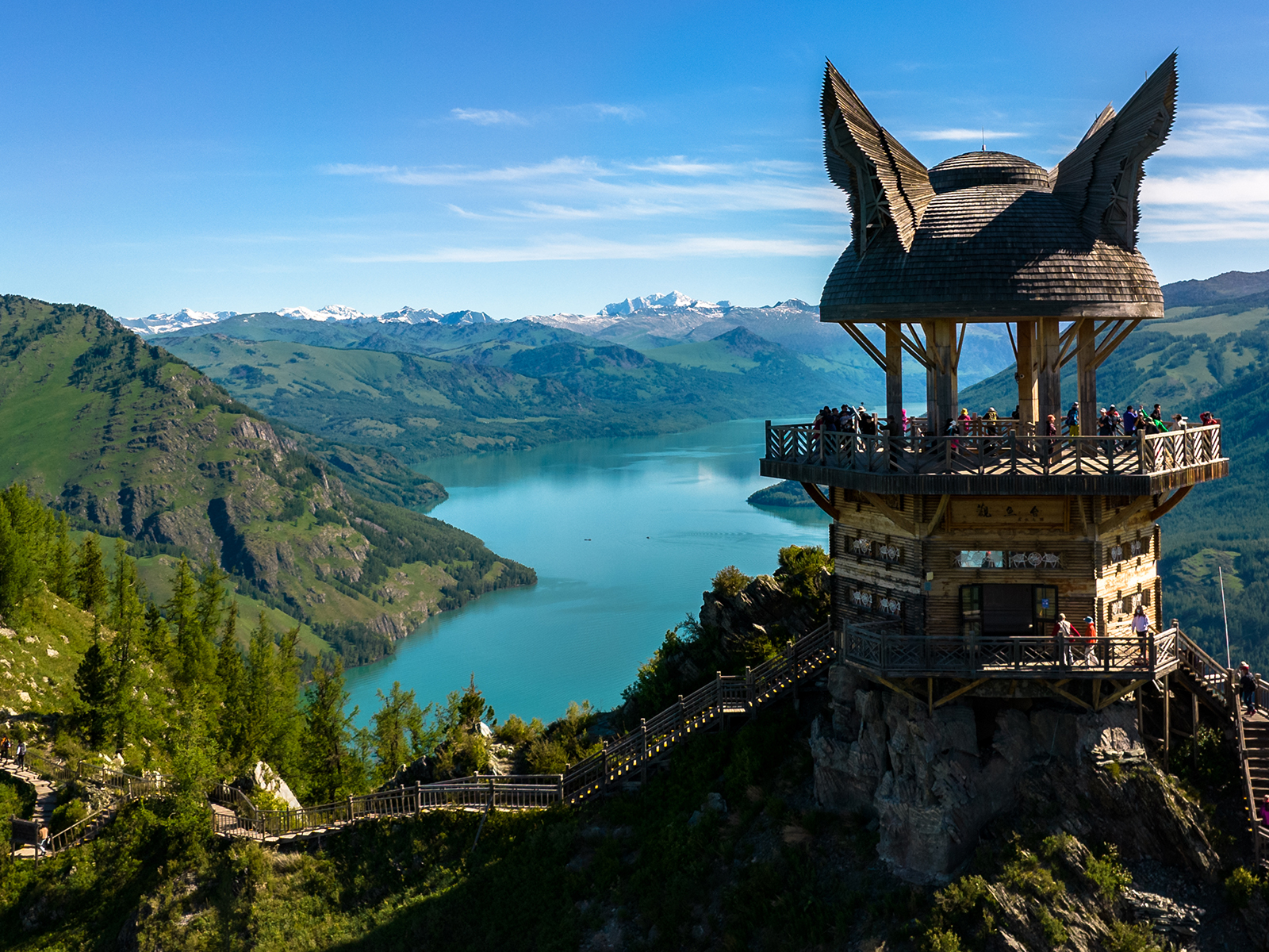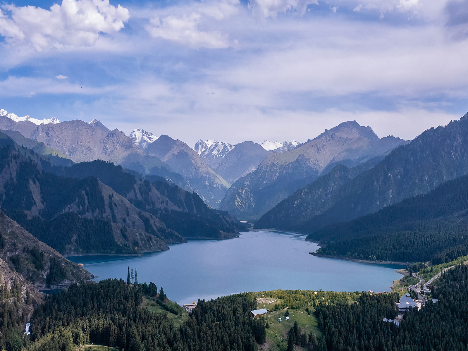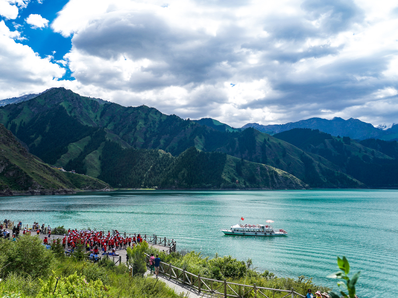 11:00 抵达著名的旅游胜地【天山天池】。湖水晶莹如玉,倒映着博格达峰,四周群山环抱,山上布满了挺拔、苍翠的云杉、塔松,犹如仙境。推荐下午晚些时候去,因为随着光线的变化,湖水会呈现近处碧绿远处蓝色的样子。