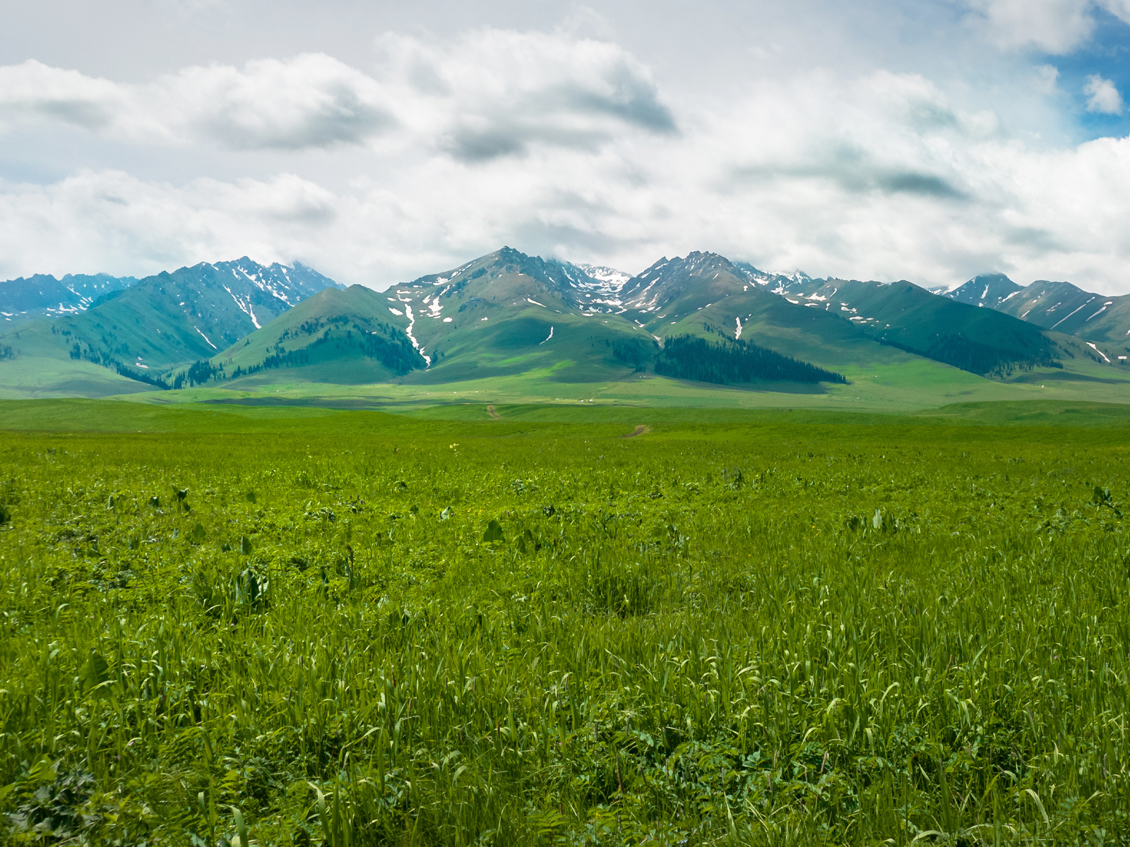 14:00 抵达【江布拉克】,初到这里的人,会错觉以为到了瑞士,没膝的党生花、贝母花和一种叫不上名的小黄花漫山遍野,就像神仙种植的一样,在草地里自然生长为好几层。远处群山起伏,层峦叠嶂,连绵不断,苍松翠柏直插云霄,雪峰、林海和绿草鲜花构成了一副秀丽的山水画卷。